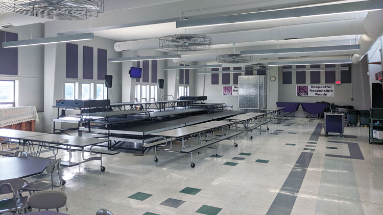 The completed choir room inside an 8,000 SF music addition at Keokuk High School is set up during an April open house with choir risers and a piano occupying the center of the space. A larger set of risers for show choir performances can be seen folded and against a wall. The show choir risers also appear in the a photo of the cafeteria taken in 2019, taking up space that now can be used for students to eat lunch. (CANCO photos)