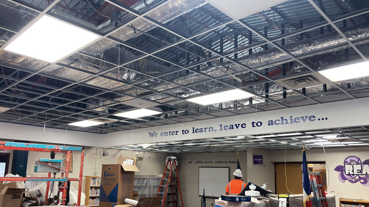 Upgrades to HVAC equipment is seen above the open drop ceiling inside the media center at Hawthorne Elementary School in Keokuk. Prior to completion of the air-quality improvement project funded by a federal grant, the building was a hodgepodge of heating, cooling and ventilation systems dating to the building’s 1957 origins, and additions built in the 1970s and 2000s. (CANCO photo by Cindy Larson)