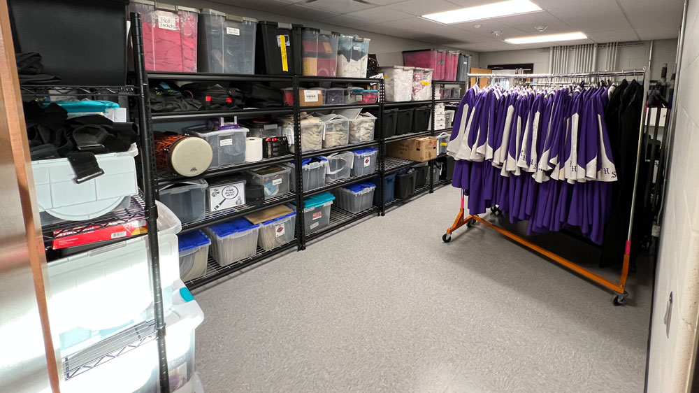 Choral program gear is stored neatly on racks and shelves in the music addition. (CANCO photo)