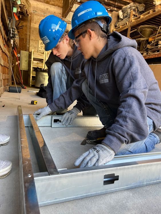 Each of the teams competing in the 2023 High School Skills Challenge at the Carl A. Nelson & Company warehouse on Oct. 5, 2023, in Burlington, was challenged to build adjoining metal stud walls and hang drywall, with openings for a door and a window. CANCO