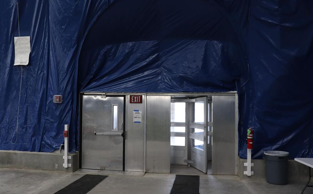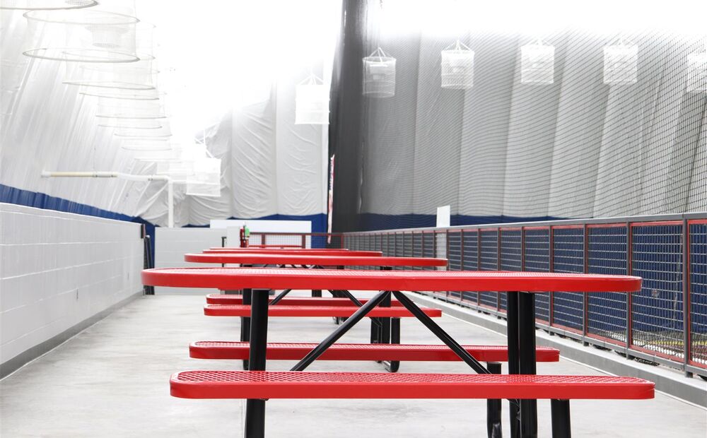 The facility also includes two, 72-foot long retractable batting cages. Use of turf overlays would allow the facility to be used for court or mat sports events.