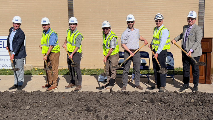 Carl A. Nelson & Company President Tim Seibert, P.E., second from left, is shown along with design team and owner representatives at the April 12, 2023 groundbreaking for a $35 million renovation and addition project at Burlington High School in Burlington, Iowa. From left are Matt Wolfert, president, Bray Architects; Seibert; Superintendent Robert Scott; School Board President Deborah Hatteberg; BHS Principal Monica Myers; Board members Darven Kendell and Anika McVey; and Business Manager Greg Reynolds. (CANCO photo)