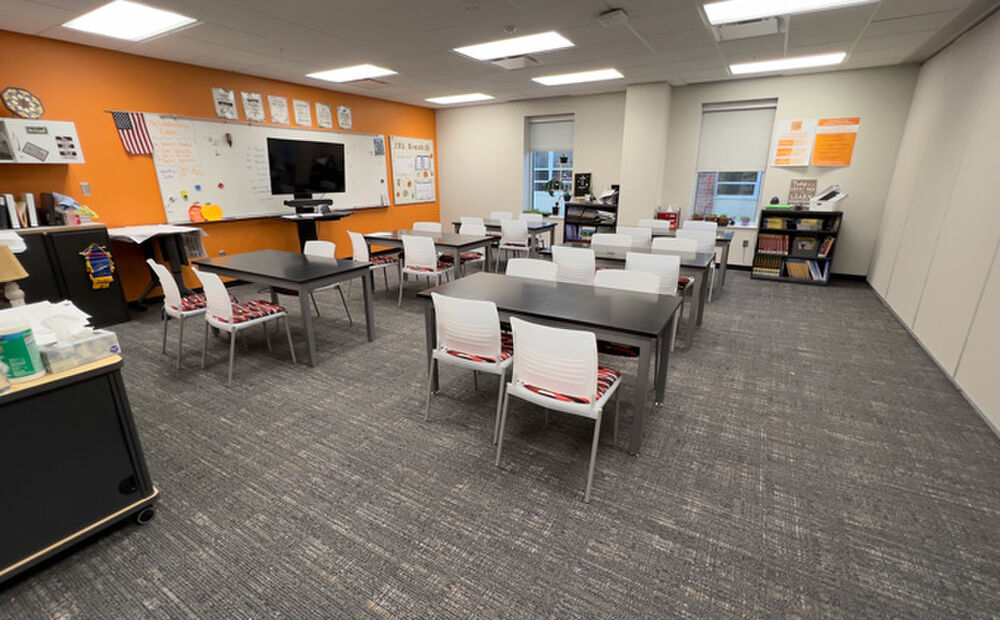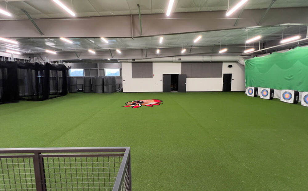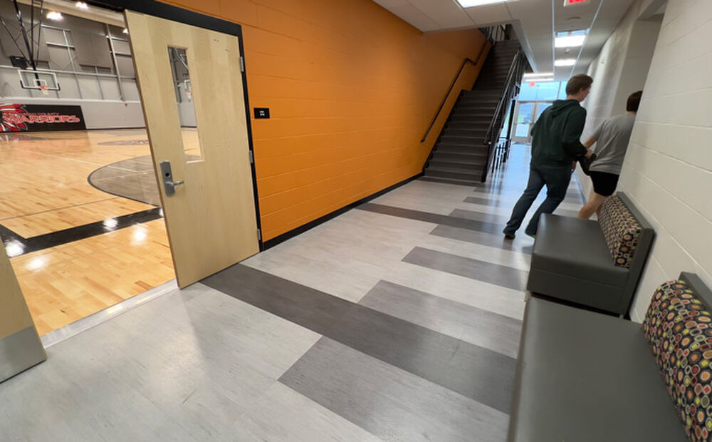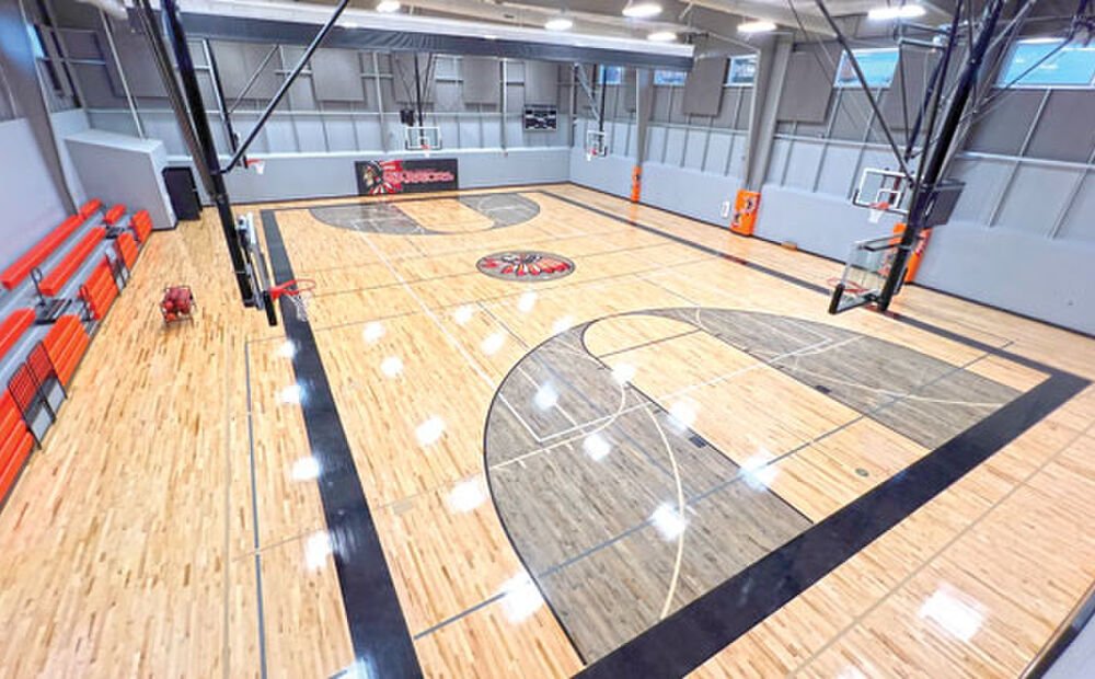 The 21,500 SF addition includes a second gym, wrestling practice room and a mezzanine area with batting cages and a turf surface, plus two general-use classrooms, new restrooms and a new public entrance for activities.