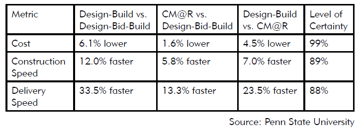 The selection of a project delivery method can have a significant impact on the success of a project and as such has been the subject of multiple research projects with statistically significant results. One of the better studies out of Penn State University looked at 351 projects across a range of project types and locations and a summary of the results shown in the accompanying chart correlates to our experience.