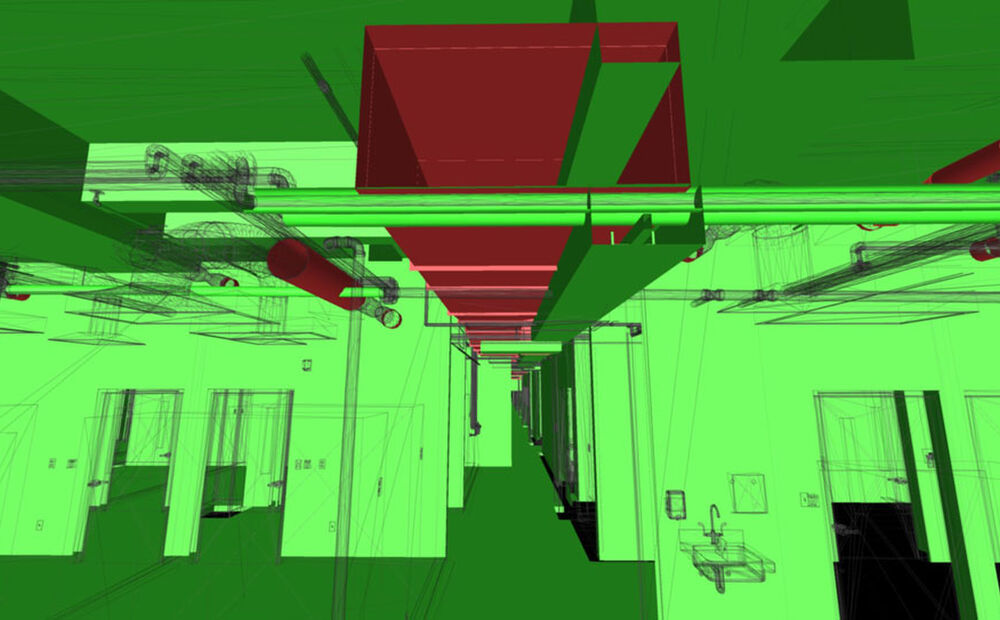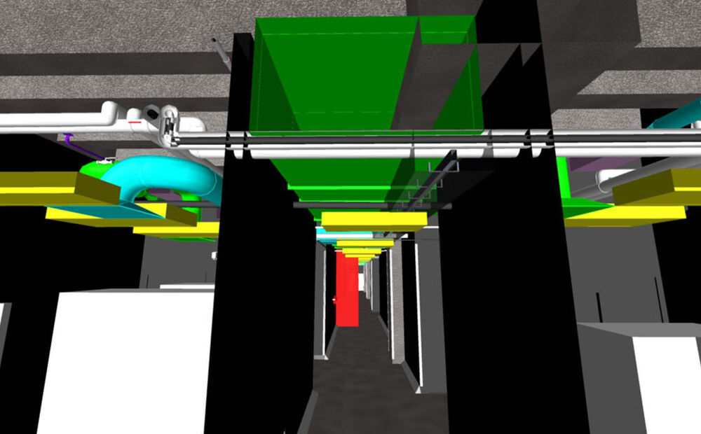 The design was provided by the University of Iowa design consultant, Rohrbach and Associates, who also provided a 3D model of the architectural design. Carl A. Nelson & Company developed the 3D model of the Electrical in house and coordinated with AutoCAD models produced by the Mechanical Subcontractors.. We then ran clash detection using NavisWorks to determine if there were any conflicts between the structure, ductwork, piping and conduit in the design. All conflicts were identified and rectified prior to construction.